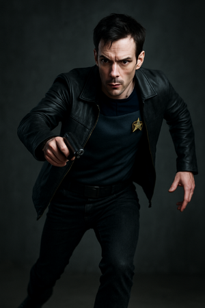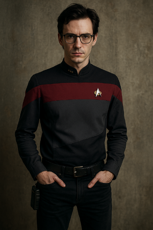 Elias Brody carries himself with the unshakable calm of someone who believes he is always on duty. His wardrobe is dark, clean-lined, and subtly futuristic — and when he turns, a Starfleet communicator badge flashes from behind his lapel. RP Hooks